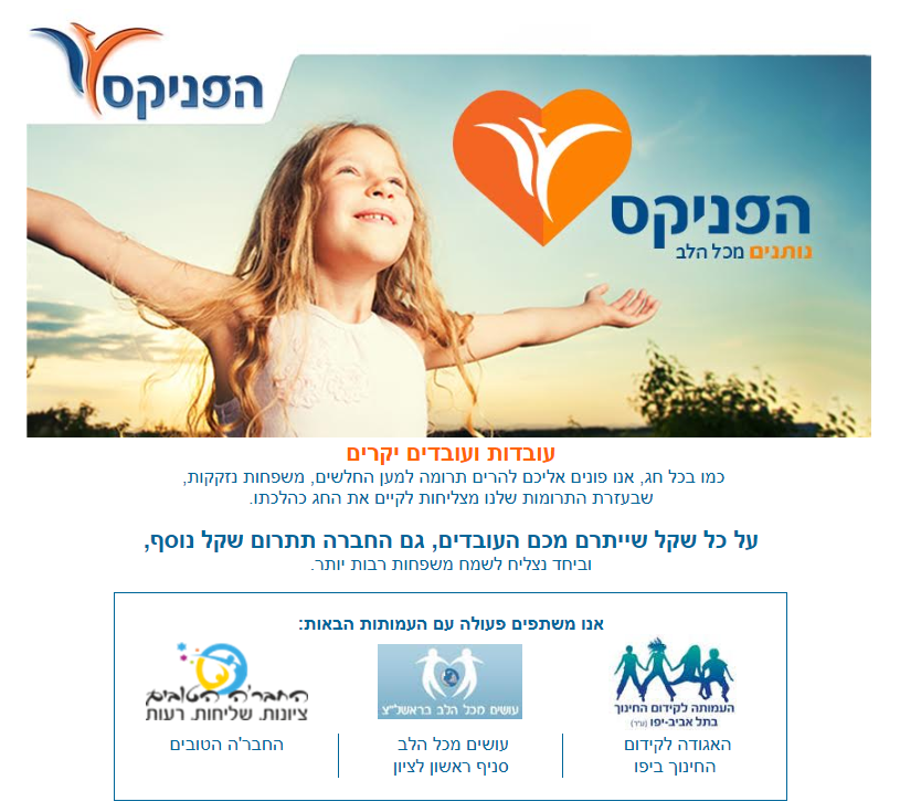 תודה רבה לחברת הפניקס, אנו מקווים לעוד שנים של שיתוף פעולה למען המשפחות הנזקקות ועם ישראל.